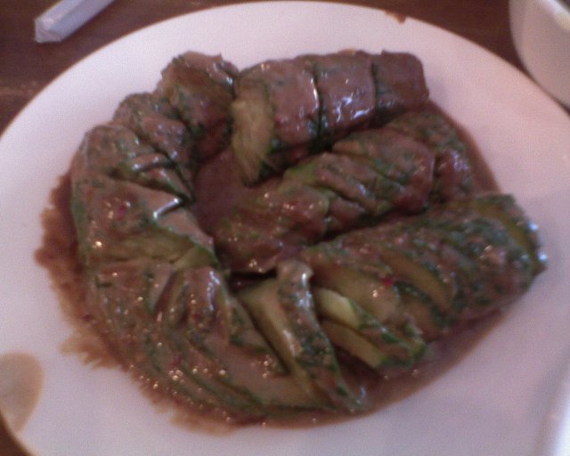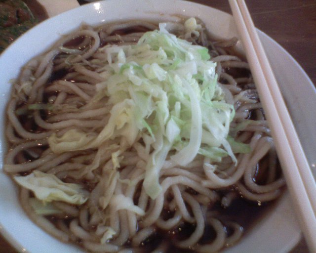 面是那种圆形的,肯定是机器压制的,还有些圆白菜,不过说实话,如果干吃这个,是什么味道都没有的。把小碗肉连汤带肉一股脑倒入面中,再加上辣椒油和醋一拌,才变得丰富起来。牛肉炖的果然很软,就是牙口不好的吃起来也没问题,而且非常的入味,不错。这里的蓑衣黄瓜和我以前吃的不一样,是麻酱拌的,这个我也会做,而且味道不逊色,所以不多说了。服务员一看就是见过大场面的,脸上都是没表情的。