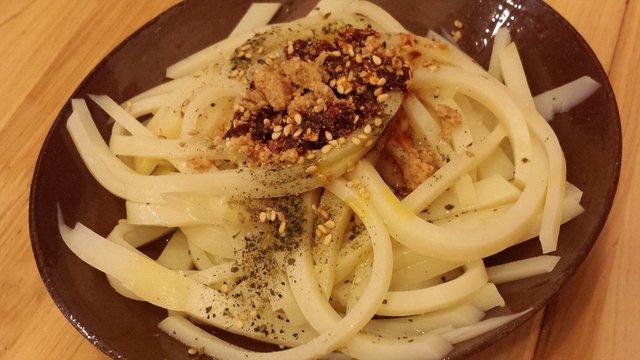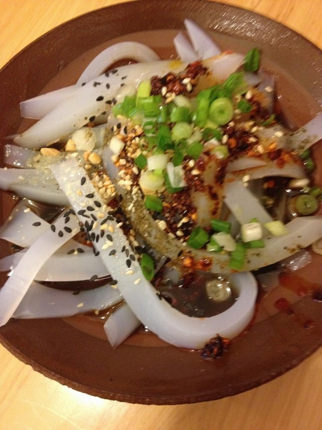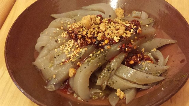 红薯凉粉颜色有点深,很少在市面上看到有这种凉粉卖,口感有点硬,拌的味道还可以。
