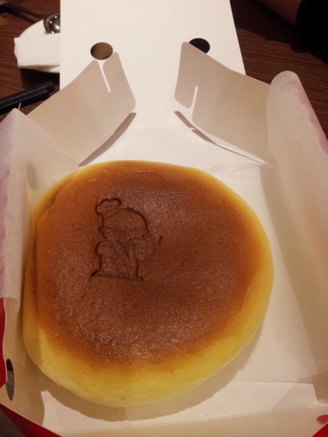 嗯 当时已经没有帽子蛋糕了 只有现烘起司蛋糕 三十九一个均价 跟苏州一样 而且一个人只能买一个 口感不错 松松软软的 应该是烘培的时候烤箱里放了很多水 所以有那种水润的感觉 不是别的蛋糕干干的那种感觉 很细腻 甜甜的 上面还有徹思叔叔特有的印记 蛋糕不算太大 也不算太厚 用手拿不起来 容易碎 味道不错 这个蛋糕值那个价钱 但是至于排队一个小时 就有点不值得了 路过碰巧没人时候买一个回去吃吃还行