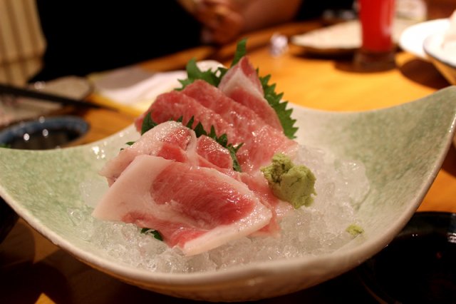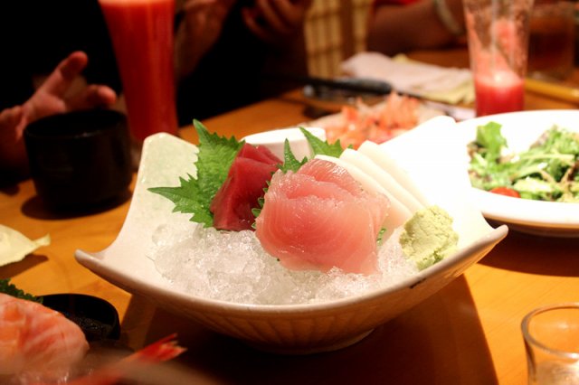 金枪鱼有红枪、白枪、粉颜色的不晓得怎么称呼了。切片很厚实,吃起来畅快呀。