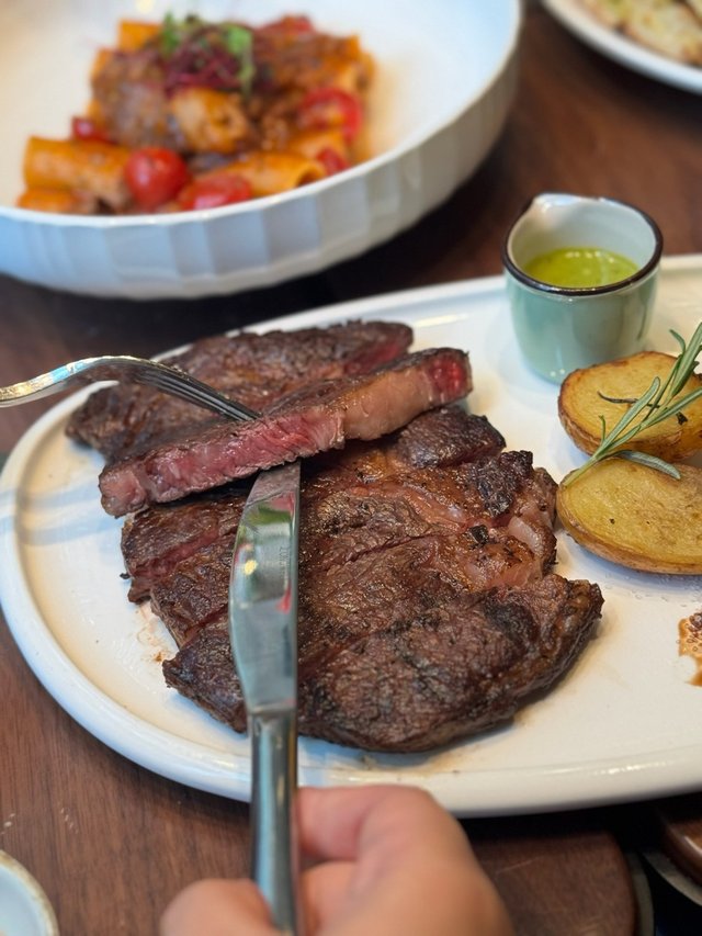 牛扒都好有驚喜,選用澳洲M3黑安格斯牛肉眼,外層煎到帶焦香,裡面粉嫩多汁,唔蘸醬就咁配胡椒鹽已經好好味。