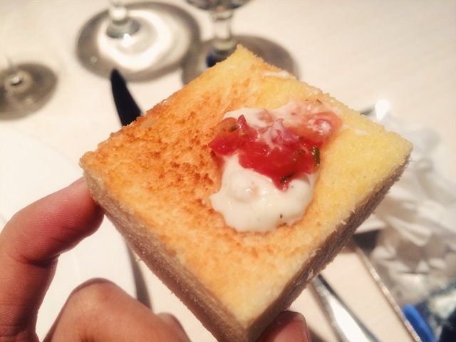 提前准备了湿纸巾,面包块是可以手取的,烤制酥脆的面包配上酸甜微咸的银鳕鱼酱和一丢丢番茄丁,虽然只是小点,入口之后给人一种即将大快朵颐的美妙感受~潜台词:连餐前面包都这么好次,其他的还用说么,哇咔咔~