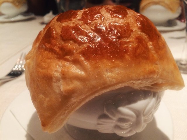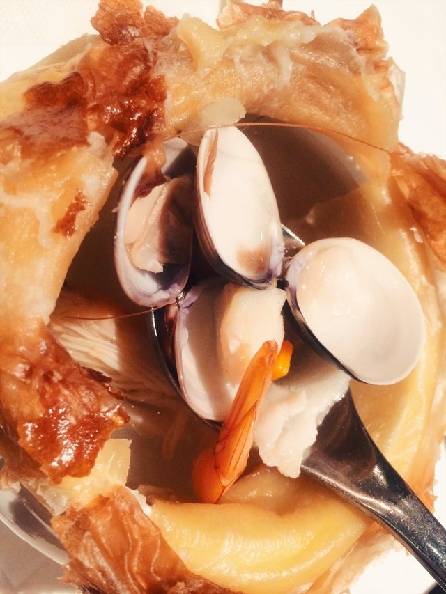 小狮子造型好Q啊,一端上来就有浓郁的黄油香。撕开起酥皮,海鲜的味道也忍不住跑出来。汤底非常清澈,可见食材是处理得当的。虾已经去除了虾身的外皮,连虾线也都处理好了。贝类、鱿鱼、带子等食材也都保留了海鲜的原味,很清爽,没有腥味。汤味道鲜美,配起酥皮一起吃,相得益彰。