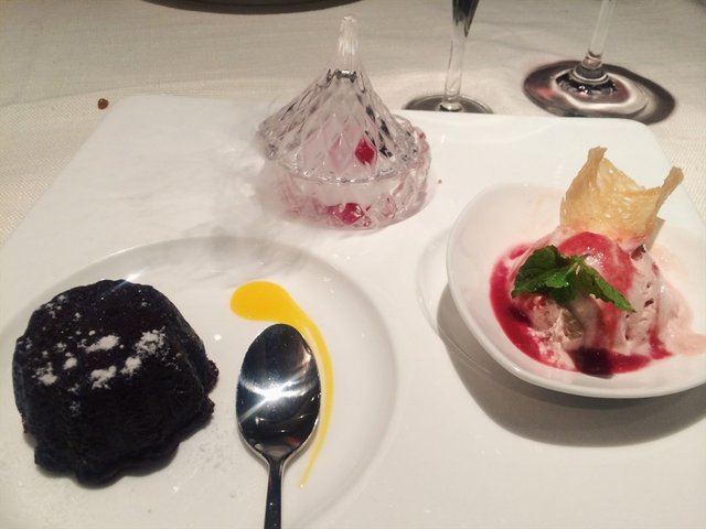 甜品作为西餐的压轴,想必都是为了给食客一个美好的ENDING吧。冒选的这道伴随着一阵烟雾就上桌了。器皿里放置了玫瑰花瓣和干冰,带给大家的绝对是视觉享受。草莓冰淇淋口感清爽,奶香浓郁,有果肉在里面,小女生的最爱。拉瓦用勺子挖一下,有浓浆流出来,因为热度不够,浓浆稍有些凝固,但丝毫不影响黑巧克力浓郁细腻的口感。稍有些甜,搭配咖啡食用刚刚好。