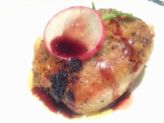 因为鹅肝酱对冒造成了阴影,这种煎制的鹅肝简直是打破了之前对鹅肝一口入口即化两口无牵无挂的印象•••鹅肝煎制之后配红酒醋酱汁,酸甜的口味完全解除了油腻感,鹅肝细腻绵软,烤苹果酸甜开胃。