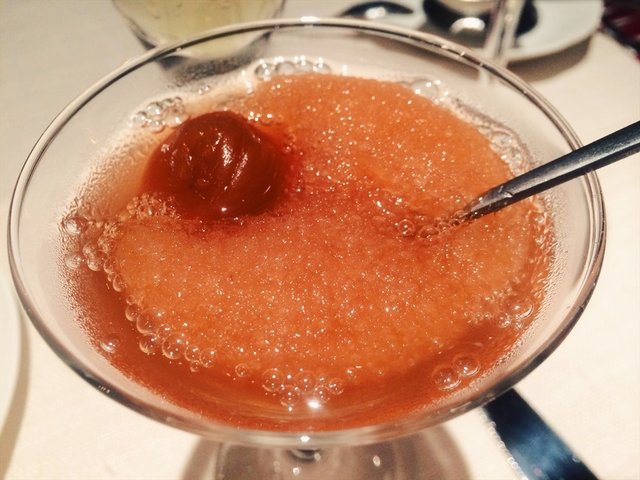 开胃酒,蜜桃含酒精甜酒,哇,绝对是冒的菜,冰凉爽口,淡淡的水果香。