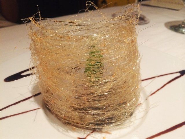 芝麻冰淇淋佐椰香奶酪,芝麻冰淇淋很少见,外层的糖丝摆盘也好美腻~妹纸为了让大家尽情拍照,冰淇淋都融化了呢,赞一下。
