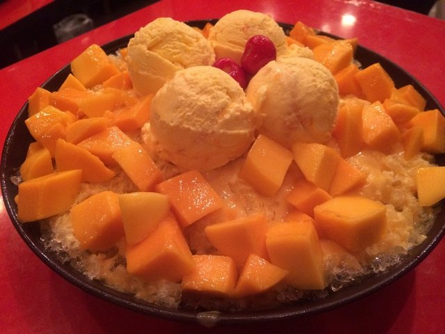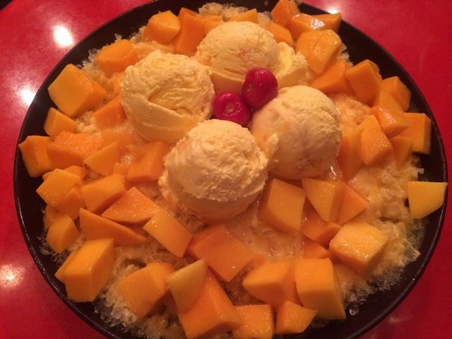 微博中奖的节奏,赶在凯莱赛最后拆掉的几天来凑个热闹,事实证明人确实是炒鸡多啊。随便一个小吃摊位都要排长队,心心念念的大x烧和王老爹焖子人最多了,果断放弃直奔甜甜向上。好吧,也是满座,等餐等了半个小时的节奏。芒果慕雪甜甜冰,48米。因为店家说芒果的比较容易做,就供应这款了。看卖相炒鸡有爱,冰上洒满了酱料和大块的芒果肉,四个芒果口味的冰淇淋球上点缀两颗樱桃,和图片无差别。比脸还大的一份,四个小伙伴吃还差不多,俩人完全HOLD不住啊。冰淇淋口感很柔滑,有果肉在里面,不过吃多了会有点腻。芒果很甜美,光是吃果肉就能吃饱的节奏。缺点是冰太硬了,都是颗粒状的需要嚼碎,更喜欢绵绵冰或者碎冰。可能这款是怕太快融化的原因吧。