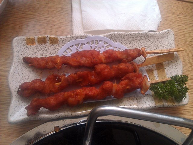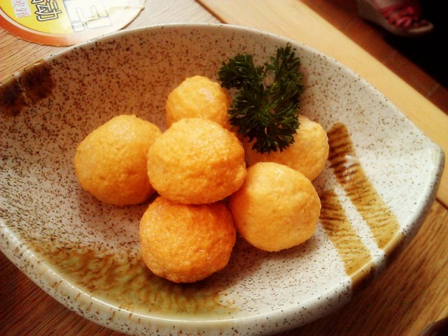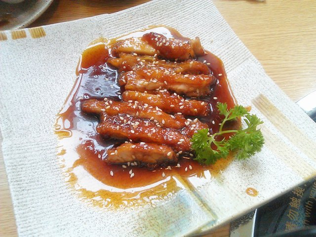 果然上面淋了酸甜的酱汁~切成小条方面我们吃~