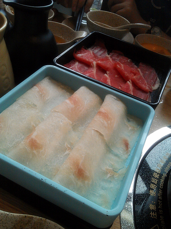 肉盘上来店员会提醒我们要涮多少时间,有点是八九秒,有的一