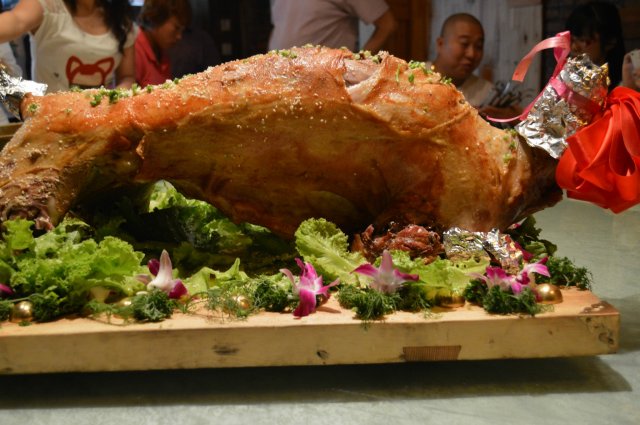 好大一只羊~~~~~两个人抬的哦!皮都焦香焦香的,花朵和蝴蝶结的装饰~~~