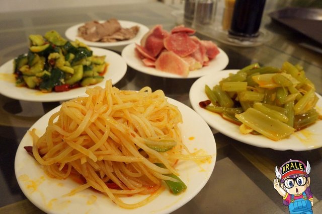 凉菜的话全是红油的辣,最好能有点儿不辣的。也有在北二七看到的甜胚子,在此之前不知道兰州小吃有这个。点了土豆丝儿,心里美萝卜,拍黄瓜,腐竹芹菜,还都可以。