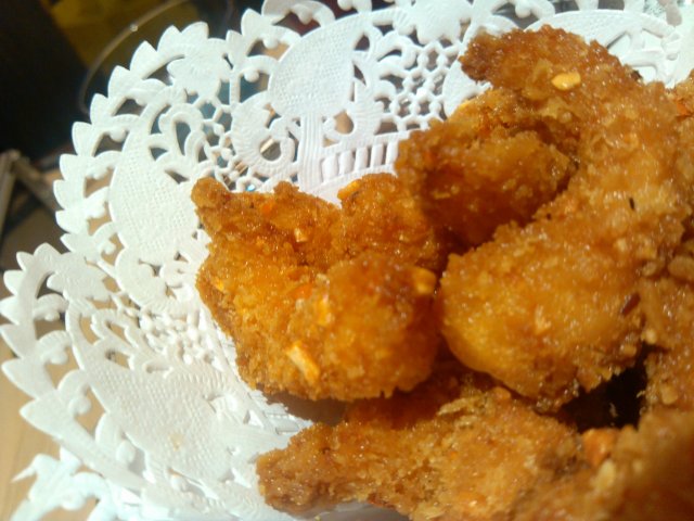 【热滚鲜虾杯】很小一份,是用冰淇淋的大杯子装上来的,就是裹了面炸的虾。倒是很香酥~~甜点是【美式冰淇淋烤布朗宁】两个人分着吃的,味道不错,冰淇淋很好吃,就是一份太少了,不够我们两人吃,下面的布朗宁里面有大大的核桃仁