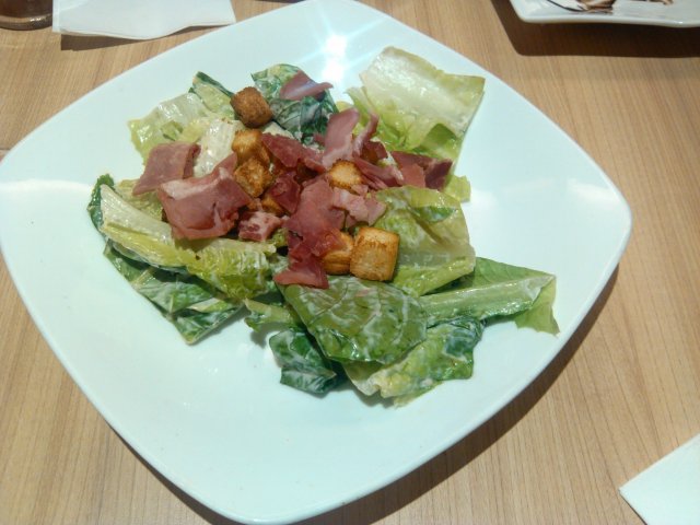 【凯撒沙拉】以前没觉得这么少啊,出奇的少啊,几片生菜,几粒炸馒头,几片培根