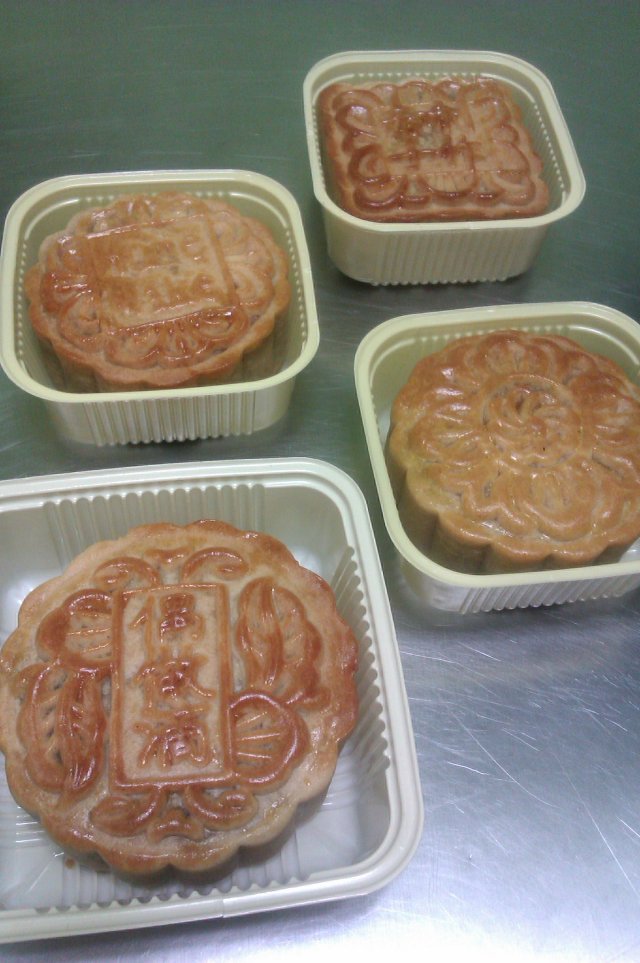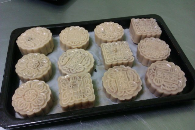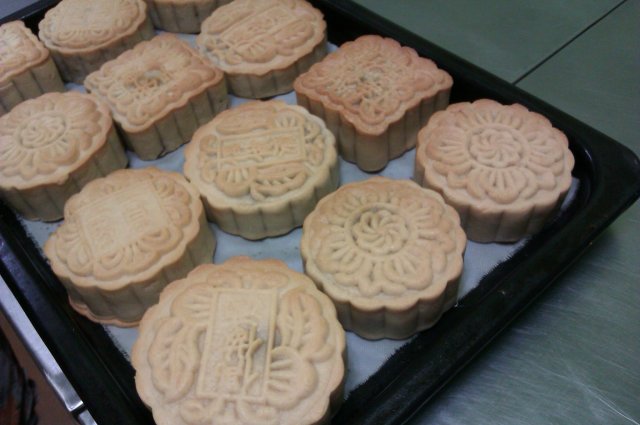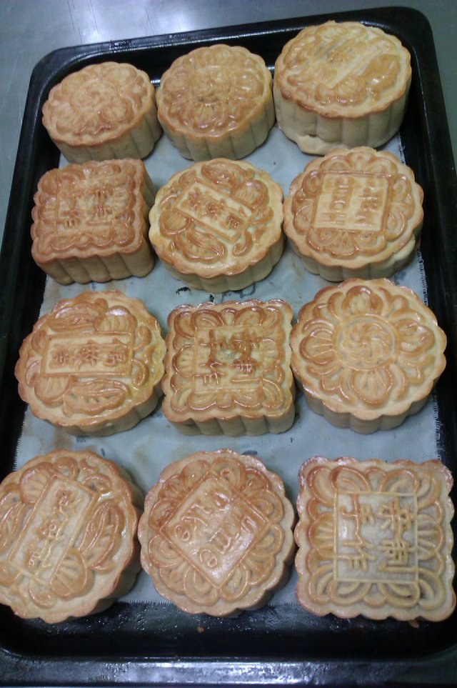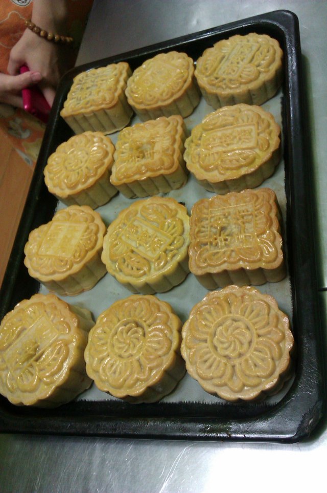 正式出炉~~~这色泽就和外面卖的月饼相去不远喽~~~很赞耶!毕竟是自己亲手做的,很有成就感!此时的月饼还很烫,要放凉了才能动手拿出来~~