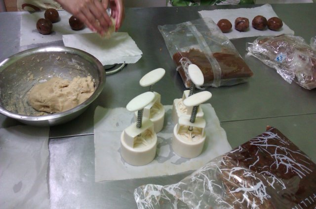 四种现成馅料,四种压制模具~~~开始还以为会像过去用木制的模子打月饼,现在都是先进的工具了~~更容易成型,花样图案也更多选择!这次准备了红莲蓉,蛋黄,香辣牛肉,蔓越莓,五仁四种馅料~~在准备面皮的时候,大厨已经把蛋黄拿去用烤箱烤熟了~~~