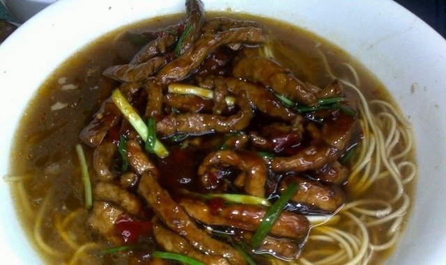 很一般的面,辣肉丝一点也不辣也不甜,可能是因为汤面的原因感觉很淡~汤头也很淡,面条是细面但不筋斗,很一般!