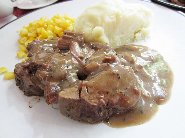 【美式烤牛肉】不得不批评一下了,这道有土豆泥,豌豆和玉米,我们选择了玉米。配有黑胡椒酱,酱料做的比较咸,牛肉的肉质非常老。土豆泥有点硬,不够细腻。