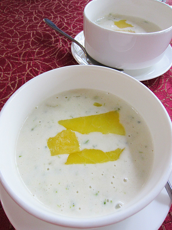 【西兰花土豆奶酪汤】第一道就有点小惊艳,原本以为汤上面的黄色物体是南瓜,原来是没有融化芝士,在用勺子搅拌后,喝了一口,很多小颗的土豆和西兰花,再加上醇香的芝士真的非常的美味。