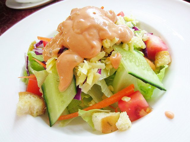 【农夫田园沙拉】第二道,点餐的时候就会问用什么酱,我们选择了比较常规的千岛酱,蔬菜都比较新鲜,上面也有芝士的小碎屑,千岛酱相伴之下还是很喜欢的。