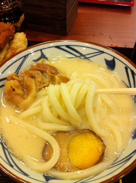 点了之后服务员现做,把半成品的乌冬放热水里过一下,浇上浓汤,放一些五花肉还有半个卤蛋