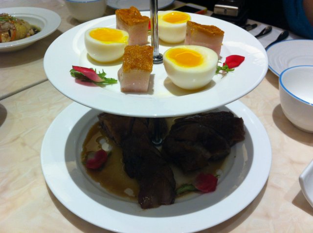 烧味拼盘,二层的拼盘很好看,上面是糖心蛋和烧肉,下面是烤鸭,烤鸭味道不错