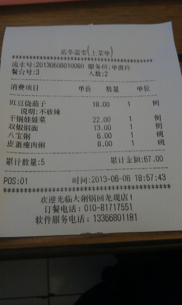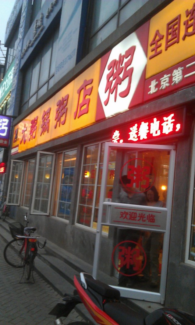 环境与服务:位于回龙观,近邻13线地铁,属于这片的繁华地段,很多饭店云集于此,这家打着粥铺的招牌,其实也有卖很多的家常菜系,自己家人吃完全可以到这里解决了。门面比较醒目,是链锁店,装修都是一样的,里面空间还蛮大的,有软座也有木制的硬座,灯光明亮,桌椅也整齐,环境不错。服务员不多,因为吃饭的人也不多,哈哈,服务不错的,有求必应,而且服务员都挺漂亮的,工作服也较统一漂亮。