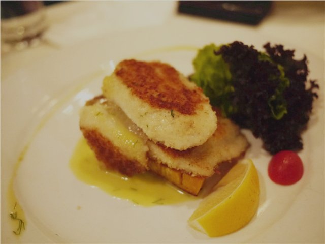 【意式烤龙俐鱼】鱼肉很嫩,火候很好,调味也不错,鱼肉下面垫了一片橙子,导致下面的鱼肉有点甜味,虽然很清香,但是还是不习惯咸甜混合在一起的感觉