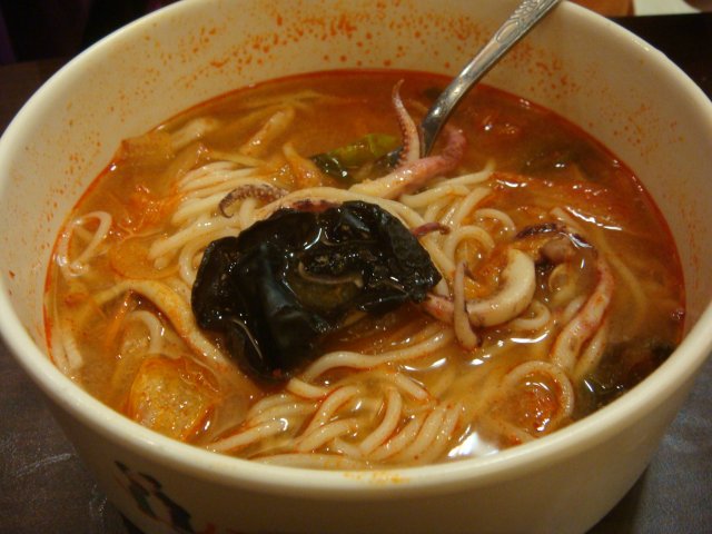还又想吃面的时候经常点海鲜火锅面,也是石锅装的,一个海虾,隐约有点鱿鱼须吧,快餐的价格就不强求什么足料了,汤头也很寡淡没有喝头,就是面条本身还顺滑劲道,整体清淡。