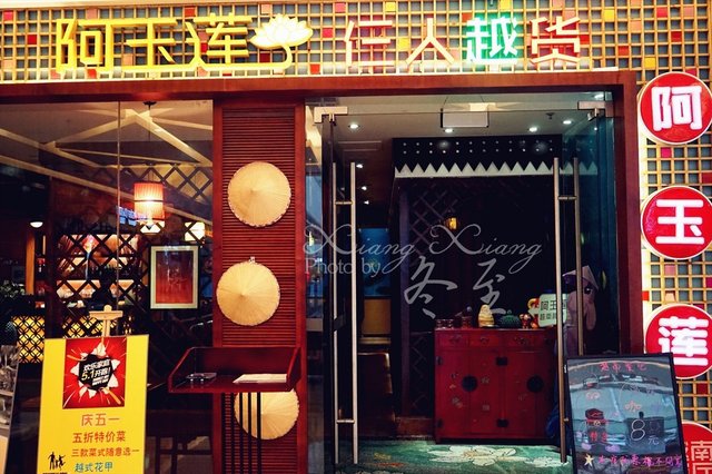 这“仨人越货”几个字用不分平卷舌的四川话来念,还真有点“月黑风高夜,杀人越货时”的背脊发紧发凉之感,不过踏入店门,温暖的色调、浓郁的越式风情就扑面而来了。(后来听店员解释,店主是仨从小玩到大的好朋友。所以这仨人越货的内涵貌似比西贡餐吧、越南餐厅更丰富更有特色吧。)店里的装修非常有东南亚特色——深色的主色调给人一种浓墨重彩的感觉,但是纱帘、丝幔又是另外一番轻巧的点缀。卡座非常有特色,私密性好,而且墙面的设计很有心思——越南电影的海报与手绘的莲花相得益彰。