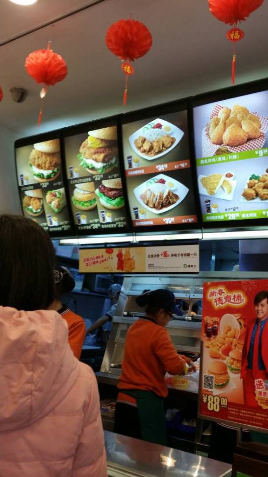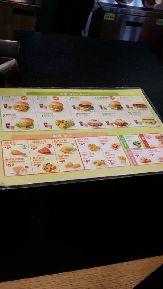 这家餐厅位于东城区大栅栏街1-1,这个位置其实很好找,就在前门可以乘坐轨车的那条街上,坐落在这条相对繁华的商业街上,客流量还不错,可能由于下午三点多中,过了高峰期,客人还是相对减少了些,我们进去的时候看到只有几个人在排队买餐,还有几个人在等位,一层的餐位不是很多,空间相对来说较小,二层比较宽敞,员工室也在二层,这里没有厕所,只有洗手的地方。我们来到了一层的点餐位置,服务员很麻利的就为我们出餐了,比较速度。我们点了两个汉堡,一份炸鸡翅根,一杯可乐。汉堡点了两种口味的,一个是超级鸡腿堡,肉很多但是生菜很少,但这汉堡里的生菜是整片的,再把番茄酱挤在上面,味道很好,大口吃肉的感觉比较爽,另一个是黑椒什么汉堡,具体忘记名字了,里面的肉是圆饼状的味道很独特,喜欢,鸡翅根开始点的时候没太在意,吃在嘴里是微辣的,和肯德基的味道差不多,这里还有咖啡饮品,奶茶饮品,当然我们没有点,但是旁边的母女喝的时候觉得奶茶像是水一样,奶茶的味道很淡,不太好喝。下次我在尝试其他的食物,这里有无限wifi,和朋友闲聊的时候可以上网看看,在这里小憩一下,是个很好的选择,当然快餐店不能避免的就是稍微有些嘈杂。