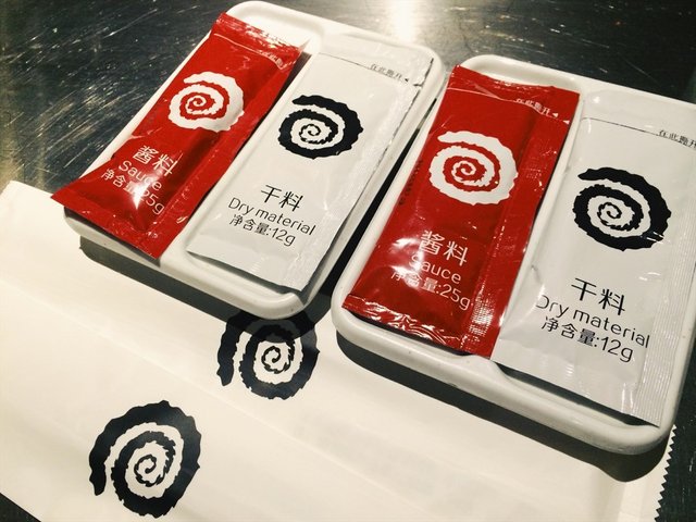 小料分成干料和酱料,强迫症患者可以发挥了。干料主要是花生粉,香气不够浓郁,没什么味道。酱料是番茄甜辣口味混合酱,无感。湿巾无异味,赞一下,那种擦完手臭臭的湿巾最讨厌了。