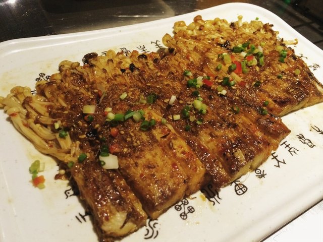 鱼豆腐,2米。很大一块啊,不过这货真心太容易烤焦了。口感劲道,配蘸料吃还成。