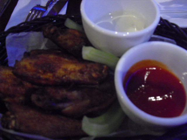 《竹蓝辣鸡翅〉50元/6个 :配有芝士酱和甜辣酱,原味地吃有点咸味,是事先腌制过的,鸡肉还是蛮鲜香的,配着的甜辣酱一起吃,更有味道,赞;芝士酱:是地道的欧式芝士,有点咸并带有芝士的纯香,喜欢原味芝士的吃吃蛮好,这些都是它家的特色菜品,呵呵;