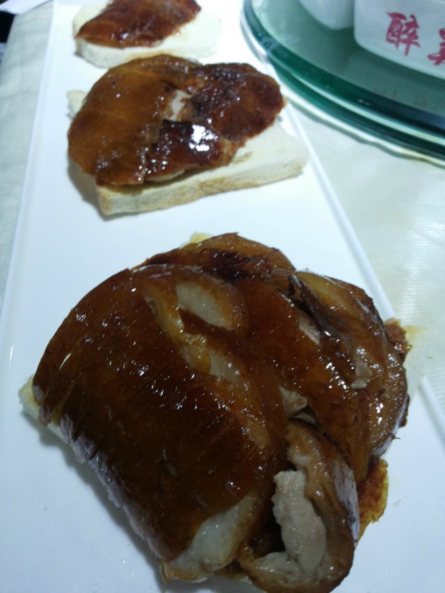 醉美酥脆烤鸭(138元)一套烤鸭,是分三分肉放在三个面包片上的,葱和饼都是类似金百万的装盘。肉的量不算大,但是味道真是不错,这点要说,烤鸭值得一吃呢。