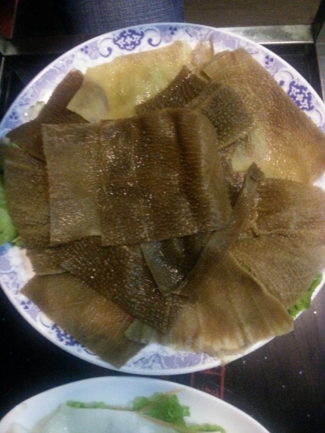 刘一手百叶,这也是必点的,百叶讲究七上八下,否则就老了,所以一定不要贪时间久,几秒钟就可以入口了,很嫩很入味,相对黄喉,有点吸辣,辣椒后反劲不小。看着盘子很大,不过量不大,只是摆开的那几片。