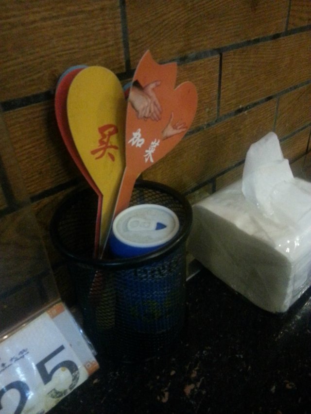 这算是爱心餐厅,餐厅有很多聋哑服务员,所以大家要耐心等待一下。很有爱的牌子,这样的餐厅相对安静一些。大家点菜加汤要举牌子哦。