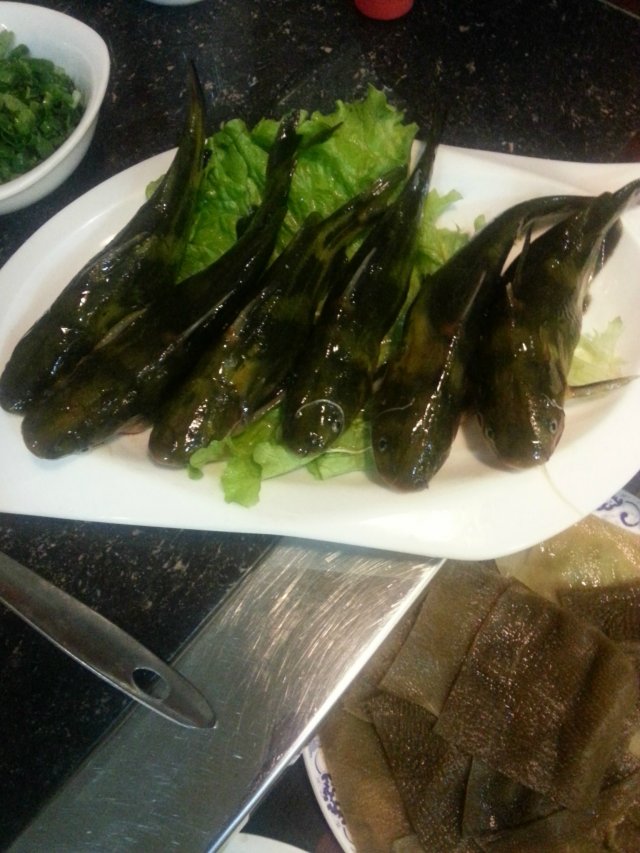 辣锅怎么能少的了黄辣丁呢,一份才6条,38米,不便宜哦,辣锅可以减少鱼腥味,黄辣丁很容易熟,自从在成都吃过一次黄辣丁,就难忘它的味道。这的黄辣丁洗的很干净,3分钟下锅足够,肉很嫩,不过个人感觉入味不深。