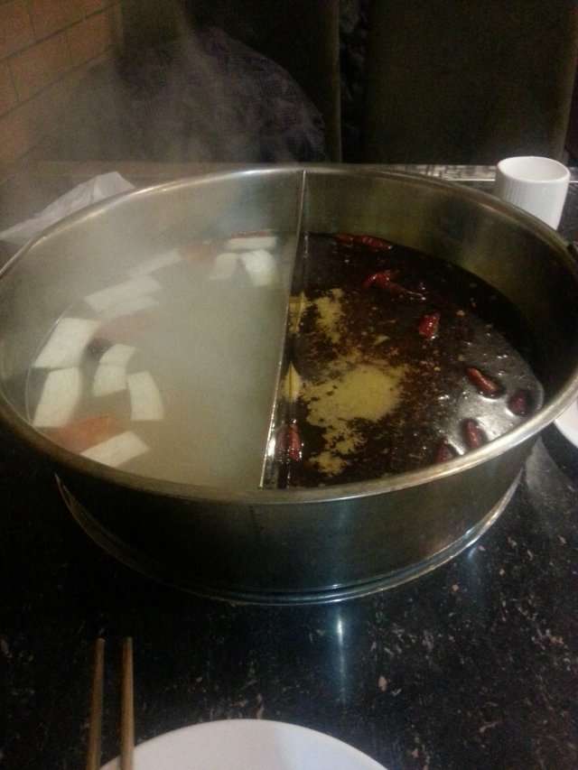 锅子很大,辣汤那边相当吸引人,看着红油在冒泡,就忍不住了。翻滚的热油,带起了锅里的底料,花椒不少哦,底料很香,香料味比较重,还有孜然,可能比较抢味儿。辣椒的味道是最棒的,入口虽然很辣,但是忍不住还想吃。