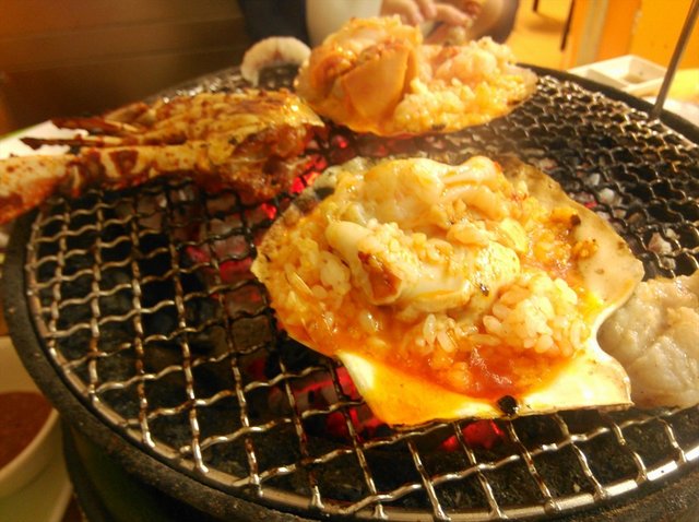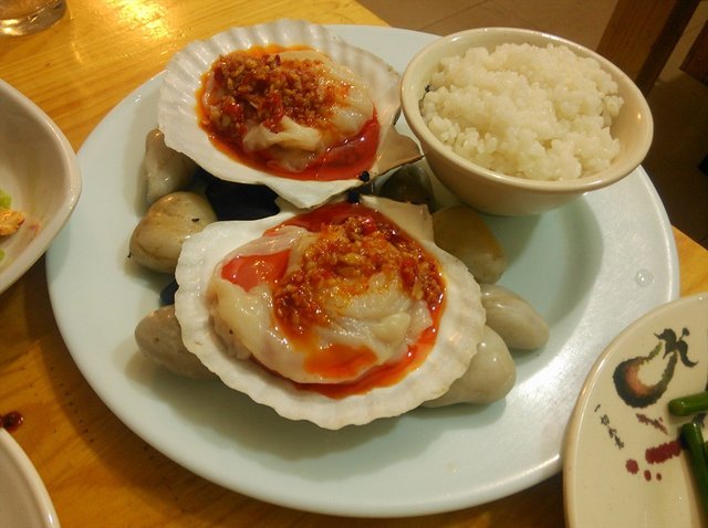 【扇贝】10元一只,我们要了两只,超级大的扇贝,处理干净的,然后拌的辣酱,有一小碗饭,特别注意了下摆盘,还有好多白色小石头子,很讲究,米饭要拌在里面,有服务员帮我们把东西弄碎,然后放在火上烤,烤的贝壳有点焦就可以吃了,好好吃,就是有点辣,这个有特殊要求的可以提一下。