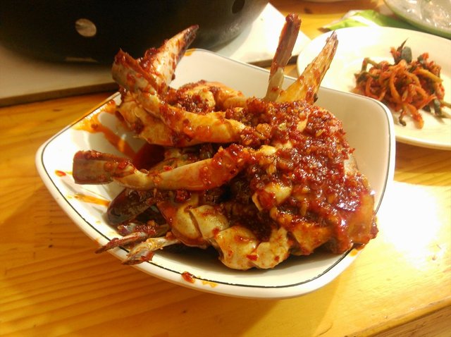 【酱螃蟹】说实话没有义气家新鲜,但是这个是白送的,而且好大,用韩式酱汁腌制的,味道还行,但是我个人不喜欢生的,所以我也烤着吃的,烤过之后那个酱都干在螃蟹上了,吃起来味道又很不一样,好吃。
