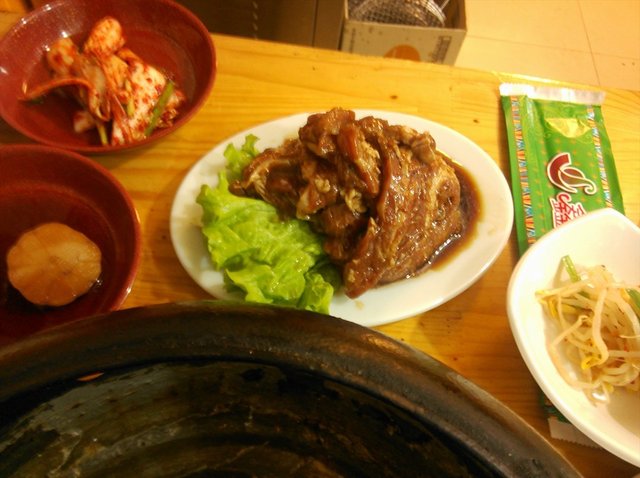【特色猪排】38元一份,其实这个就是一盘烤肉,但是肉是煨过的,肉特别多,而且很实惠,味道非常好,这个也有配生菜和韩式烤肉酱还有大蒜,但是个人觉得不用包也很好吃,而且还有专门的蘸肉料,是香油加的椒盐,太喜欢这个料了,好吃,肉也新鲜入味。量又足,很推荐。