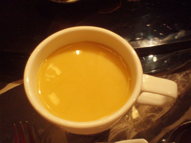 该店位置不算好找,但是一下国贸公交站台稍微一流意还是很明显看到的,要是做地铁就比较难找了,从店家上楼的部位看不出里面会很好,但是走入大堂,金亮亮的灯光照着前台大厅,大厅的部分格调很有泰国风味,走进餐厅里面,暗暗的灯光照着很适合朋友们小聚,里面的格局就没有那么浓厚的泰国风味,但是墙面上的壁画和面具都很代表着泰国风!我们做到包间名字也有很味‘普吉岛’嘿嘿,刚落座就上了一杯很香浓的