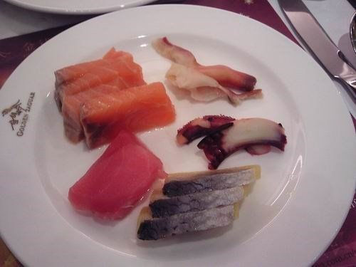 刺身拿了些三文鱼、红金枪、西零鱼籽,三文鱼的盘子永远都是空的,因为厨师刚放上去,马上就会被一抢而空,拿了几片,懒得去抢了~~~