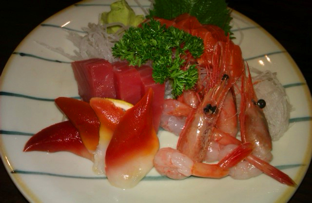 三文鱼3片、金枪鱼3片、北极贝4片、甜虾4只。