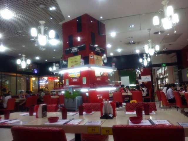 装修是九锅一堂一贯的红黑色彩风格;因为是简餐店,略微有点嘈杂