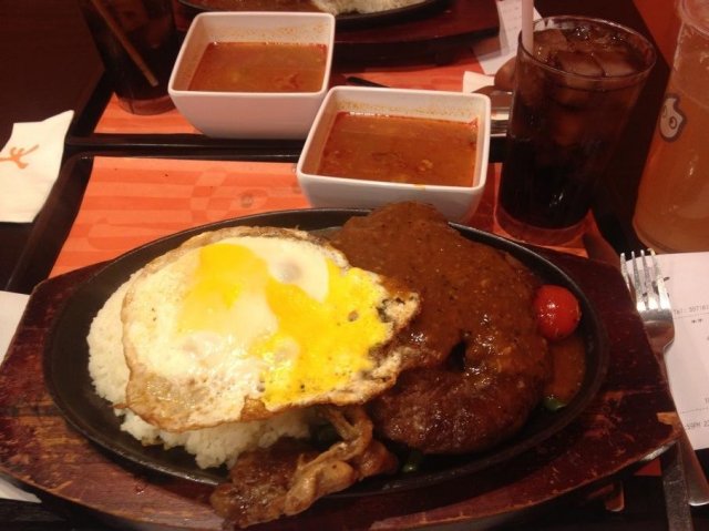 大悦城这家店环境比较一般,主要是闹哄哄的特别像菜市场。到了先找位置,然后在一进门右边的墙上有菜单,上面有价钱和图片,记住选择的餐的号码去点餐交钱,给个牌子在位置等着就行了。等了大约二十多分钟吧,我点的是火焰牛排还是叫什么的一个套餐,服务员把东西端来,酱汁淋上,点上火焖个二十秒就开吃了。牛肉挺嫩的,两大块,吃起来黑椒味很浓,很下饭,缺点就是凉的特别快,凉了就有些吃不下去的感觉了,里面还有两颗小番茄,就是个摆设,鸡蛋没什么味道,套餐里还有一个可乐和一个汤,这个是自己选的,汤挺好喝的,里面有番茄胡萝卜和牛肉,淡淡的番茄味有点酸,挺开胃的,这个套餐是56块钱,还算可以吧。