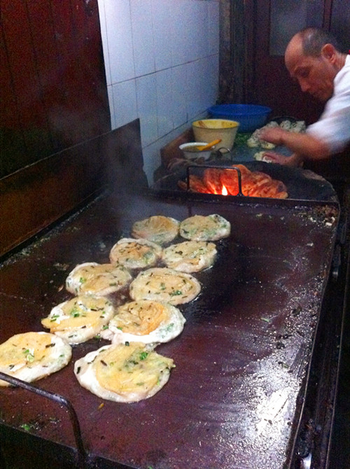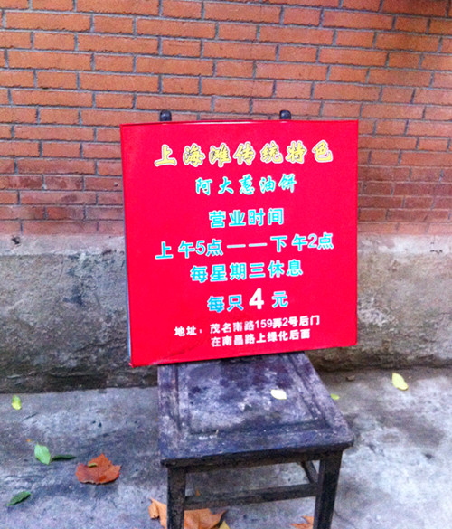 估计这家是上海滩最有名气的葱油饼了吧!想吃到还真要花点时间和耐心呢,等上一个钟头是基本啦!也许也正因如此,大家一次都会多买上几只,要不等那么久蛮不划算的哈.4米一只真心不便宜,但毕竟是传统的古法烧制,吃到的机会不多,也就不计较了.一炉大概20只左右,活好的面团里面加入了大量的葱花和猪油,先在炉子上将两面煎金黄并不停地翻转,直到微微焦,然后再放到炉子里烘烤个两分钟左右,这样就会去掉饼表面多余的油,吃起来也就没那么油腻了.话说这葱油饼真的好香啊,烤的非常的酥脆,葱油的咸香让人吃了停不下来.真心不错,不过一定要趁热吃才最棒额!