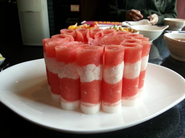 福华肥牛一盘是200克。肉卷都立着放在盘子里,摆盘很漂亮。肥牛肥瘦相间,肉片很薄,下锅稍煮即熟,煮熟的肉片不松散,卷在一起吃着很劲道有嚼劲,肉香浓郁,吸收了番茄汤底的鲜味,吃着非常香。