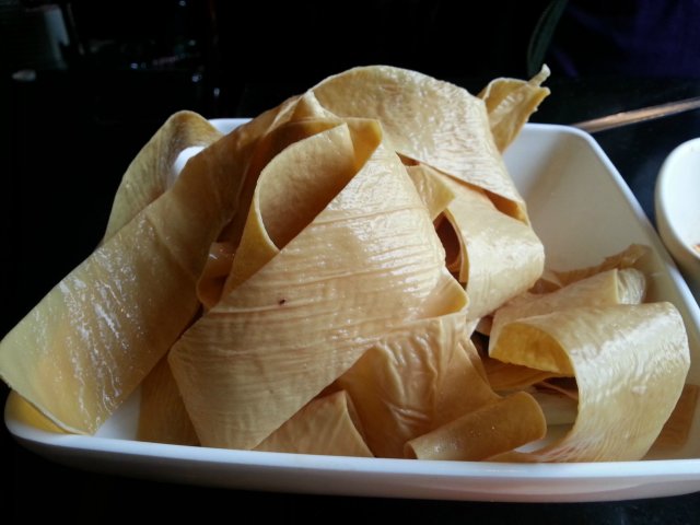 油豆皮是吃火锅必点的一道菜,这里的豆皮给的量还是挺大的,豆皮切成很宽的条状,闻着有豆香味。煮熟后的豆皮有一些弹性,吃着很香。